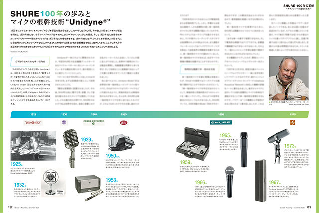 1925年の創業以来、100年間にわたって音響機器のシーンをけん引してきたSHURE。そのヒストリーを振り返りつつ、近年の製品のユーザー・インプレッションや最新テクノロジーの解説も展開し、ブランドとしての功績と力をあらためて紹介する。