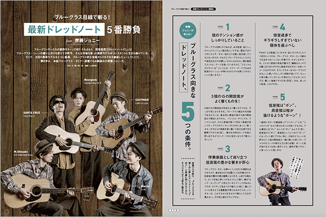 ブルーグラスと言えばドレッドノート。本家マーティンはもちろんだが、コリングスやサンタ・クルーズ、ボジョア、プレストン・トンプソンなどブティック・ブランドも漏れなく、ブルーグラッサー御用達のドレッドノート・モデルをラインナップしている。近年ではコストパフォーマンスの高いイーストマンや、IRISなどのラウンドショルダー・ドレッドノートという新たなカテゴリーも定着してきた。そんなドレッドノートの最前線を、齊藤ジョニーが試奏し、実力を検証していく。