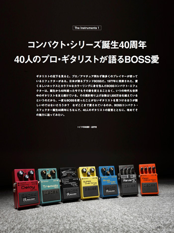 ギタリストの足下を見ると、プロ/アマチュア問わず数多くのプレイヤーが使っているエフェクターがある。日本が誇るブランドBOSSだ。1977年に発表された、愛くるしいルックスとカラフルなカラーリングに身を包んだBOSSコンパクト・エフェクターは、誕生から40年たった今でもその姿を変えることなく、いつの時代も世界中のギタリストを支え続けている。その累計売り上げ台数は1,500万台を超えているというのだから、一度もBOSSを使ったことがないギタリストを見つけるほうが難しいのではないだろうか? なぜここまで愛されているのか、BOSSコンパクト・エフェクター誕生40周年にちなんで、40人のギタリストの証言とともに、改めてその魅力に迫ってみたい。