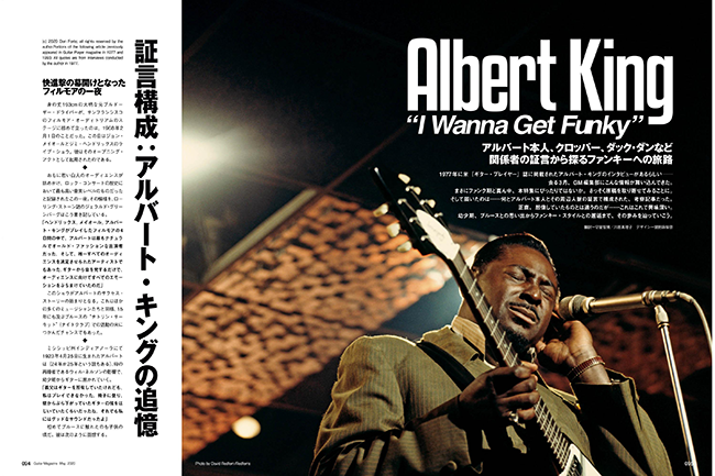 1977 年に米『ギター・プレイヤー誌』に掲載されたアルバート・キングのインタビューがあるらしい──。去る3月、GM編集部にこんな情報が舞い込んできた。 まさにファンク期ど真ん中、本特集にぴったりではないか。さっそく原稿を取り寄せてみることに。 そして届いたのは......何とアルバート本人とその周辺人脈の証言で構成された、考察記事だった。正直、想像していたものとは違うのだが......これはこれで興味深い。 幼少期、ブルースとの思い出からファンキー・スタイルとの邂逅まで、その歩みを辿っていこう。