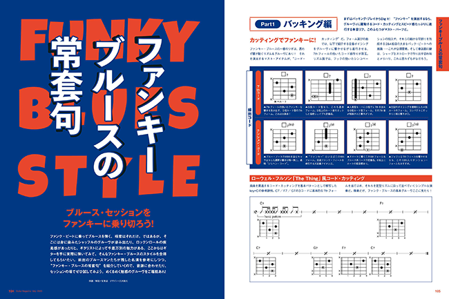 ファンク・ビートに乗ってブルースを弾く、極意はそれだけ。ではあるが、そこには身に染みたシャッフルのグルーヴが滲み出たり、ロックンロールの疾走感があったりと、ギタリストによって千差万別の魅力がある。ここからはギターを手に実際に弾いてみて、そんなファンキー・ブルースのスタイルを会得してもらいたい。前出のブルースマンたちが残した名演を参考にしつつ、"ファンキー・ブルースの常套句"を紹介していくので、音源に合わせたり、セッションの場でぜひ試してみよう。めくるめく魅惑のグルーヴをご堪能あれ!