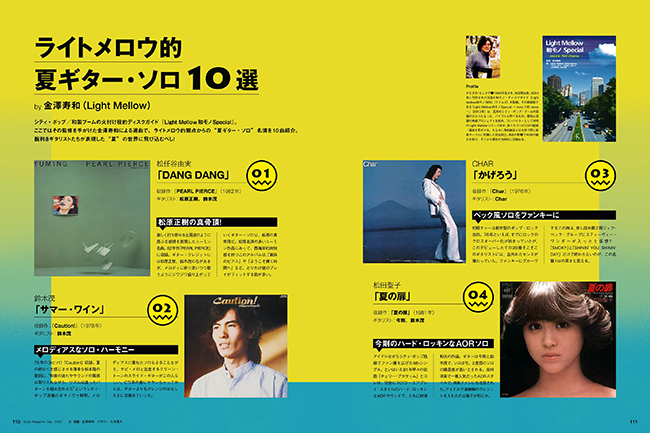 シティ・ポップ/和製ブームの火付け役的ディスクガイド『Light Mellow 和モノ Special』。ここではその監修を手がけた金澤寿和による選曲で、ライトメロウ的観点からの"夏ギター・ソロ"名演を10曲紹介。腕利きギタリストたちが表現した"夏"の世界に飛び込むべし!