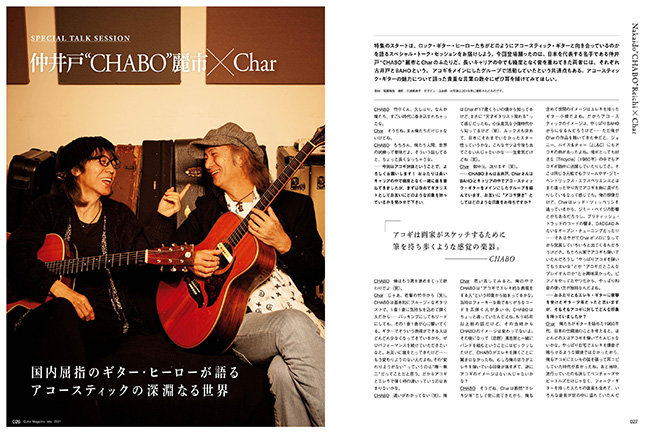 特集のスタートは、ロック・ギター・ヒーローたちがどのようにアコースティック・ギターと向き合っているのかを語るスペシャル・トーク・セッションをお届けしよう。今回登場願ったのは、日本を代表する名手である仲井戸"CHABO"麗市とCharのふたりだ。長いキャリアの中でも幾度となく音を重ねてきた両者には、それぞれ古井戸とBAHOという、アコギをメインにしたグループで活動していたという共通点もある。アコースティック・ギターの魅力について語った貴重な言葉の数々にぜひ耳を傾けてみてほしい。