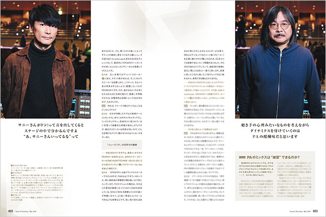 サンレコ今号のテーマは「PA・ライブ音響」。その世界にアーティストの視点から強く関心を持ち、意欲的かつ実験的な取り組みを行ってきたサカナクション。フロントマンでありコンセプターの山口一郎、そしてバンドのライブ・ミックスを手掛けてきたエンジニアの佐々木幸生を招き、PAについて語り合っていただく。