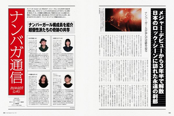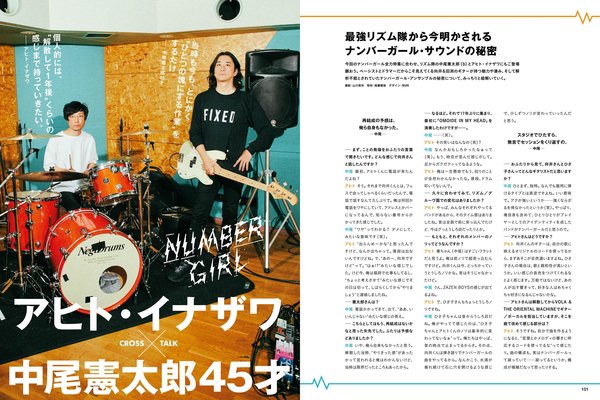 そんなナンバーガールのギターを担当するのは、向井秀徳と田渕ひさ子の両人。向井はテレキャスター、田渕はジャズマスターの当代きっての使い手です。このふたりが渾然一体となって生み出すギター・アンサンブル。それは、ナンバーガールが表現する世界の中核をなすものと言えます。殺気、懐かしさ、清涼感、はたまた可笑しささえも感じる独特のムード。あれは一体、どのようにして作り上げるのだろう? 解析不能とも言われる彼らのサウンドの秘密に、少しでも迫ってみたいーー。そこで本誌では、通常の音楽誌とは違う切り口で、"ナンバーガール・サウンドが持つ魅力"を紐解くことにしました。中尾憲太郎(b)とアヒト・イナザワ(d)のリズム・チームにも登場願い、130ページの大ボリュームで徹底的に掘り下げます。日本人アーティストでこれほどのボリュームを割くのは本誌の歴史を見てもほかにありません。