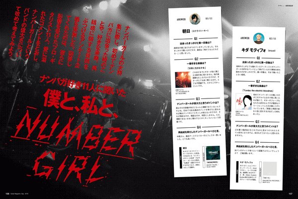 初めてナンバガに出会った時のことや、好きな楽曲、再結成に関する質問をぶつけるアンケート企画を実施。プロ・ギタリスト11人の愛に溢れたコメントをとおし、ナンバーガールというバンドの偉大さについて改めて考えてみます。