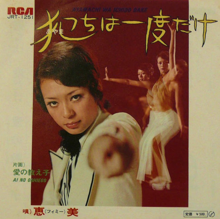 リンダ・フォロワーとしてはRCAの恵美「犯ちは一度だけ」も。こちらもやはり都倉俊一作曲だが、作詞は千家和也で、歌唱法までリンダそっくりに縦に口を開けるあの歌い方。「男なら誰も目がくらむ」とかドスの効いた声で迫りくる。B面「愛の教え子」も同じ作家陣だが、一転してカマトト声で甘い歌い方になるのもリンダと同じか。恵美は台湾出身だが、中国語は喋れないという変わった経歴の在日華僑二世で、蕭恵美の名で72年に「雨、そして別れ」でデビュー。ちょうどこの73~74年は、アジア圏の女性シンガーが次々と日本でデビューを果たした時期でもあり、彼女もその一環と捉えることもできる。3作目の「男性諸君」を出した後、テイチクに移籍し74年に「マジック・ファイヤー」を発表。「ファイヤー!」と異形の雄叫びを加えた疾走感抜群のファンキー・ディスコ歌謡で、ちなみに寺内タケシとブルージーンズをバックにした3人組男性アイドルのザ・サザンクロスと競作扱い。彼女はここで打ち止めとなった。