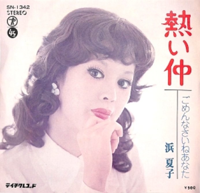 73年発売のテイチク浜夏子「熱い仲」は、奥村チヨ時代のフェロモン歌謡を70年代的にグルーヴ感を加えアップテンポにした、ありそうでなかった楽曲で、妙に高めのキーで甘やかに歌うがゆえに、フェロモン濃度が異様に高い。いじめていいのよ、とかやはり受け身の女性像で、歌い出しの前に「アーッン」と吐息が入り、歌の各所も吐息混じりで「いやはぁーん」「つヴらいわぁーん」といった具合。ここまでのテンポ感で吐息唱法というのは、タメが効かない分、なかなかに歌唱技術が必要だが、浜夏子はかなり上級。作詞はみなみ修、作編曲は演歌系のアレンジャーとして名高い京健輔。浜夏子はプロフィールによると52年生まれとあるのでこの時点で21歳だが、ジャケットを見る限りは30オーバーの熟女ムードむんむんである。