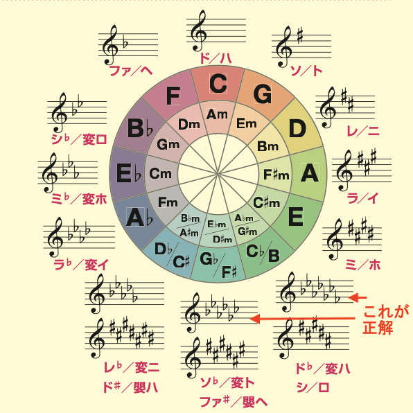 ※フラット7個が変ハ長調、フラット6個が変ト長調となります