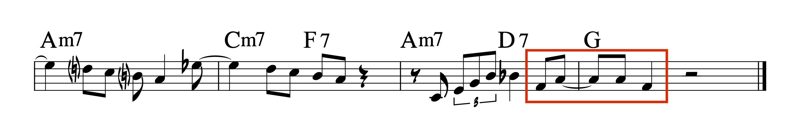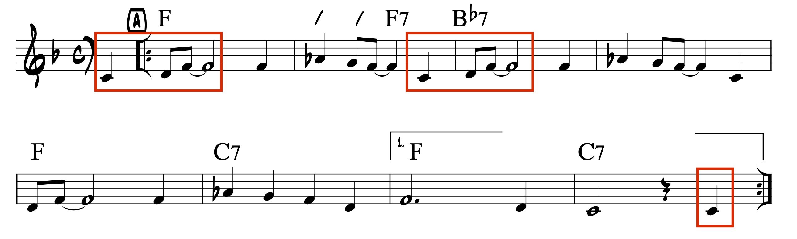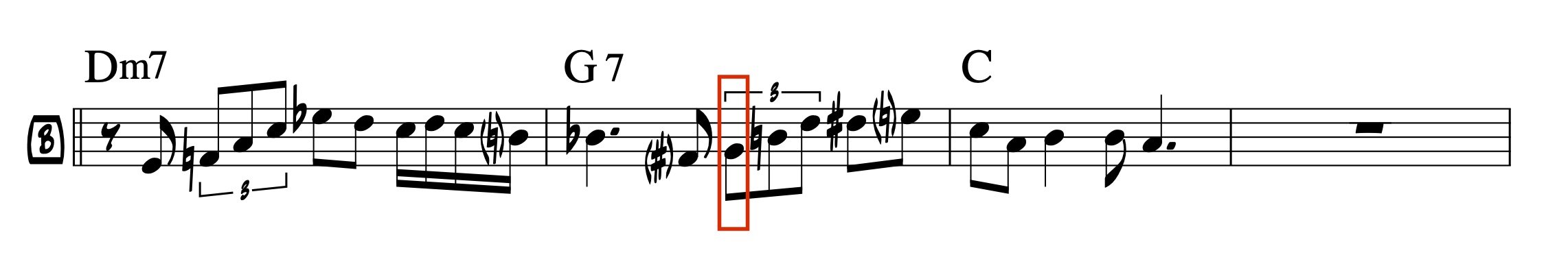 正しくは以下の譜面の通りです。Bセクションの後のAセクションも同様です。