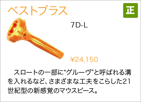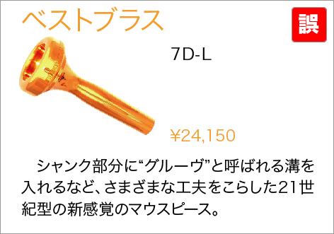 現行品マウスピース・カタログ内ページ下段、トロンボーン・マウスピースのベストブラス 7D-Lの商品説明部分に間違いがございました。