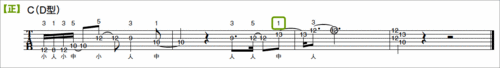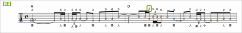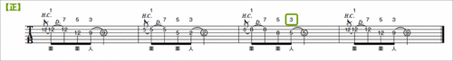 ・1段目 3小節目 2拍目 5弦3フレットの度数:【誤】5【正】1
