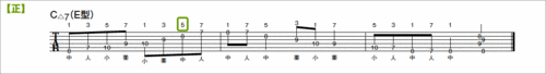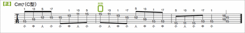 【誤】Cm7の場合、6弦7fのB♭音から弾き始めます