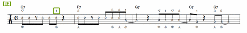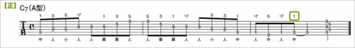 【誤】C7の場合6弦7fのB♭音から弾き始めます