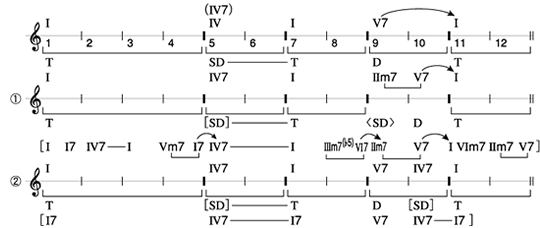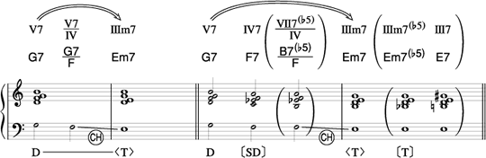 この部分の進行は、III m7(♭5)→VI 7→II m7となる。またそれに伴って、ドミナント・モーションのアナライズ記号はVI 7→II m7に、トゥー・ファイブのアナライズ記号はIII m7(♭5)→VI 7およびII m7→V7の部分に示される。(正しくは下記の画像の通りとなります)