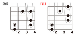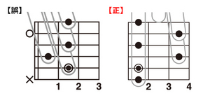 【誤】このフォームをセーハしない場合の利点はあまりありませんが、C△7-C♯dim-Dm7(9)と動く時にはこのフォームを使うと良いでしょう。詳しくは、P093で解説しています。