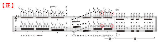 1弦12フレット(E音)と表記されていますが、正しくは1弦13フレット(F音)になります。