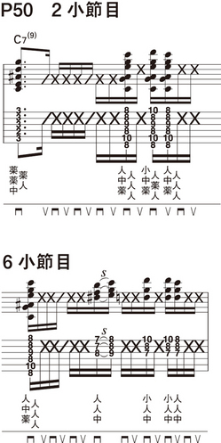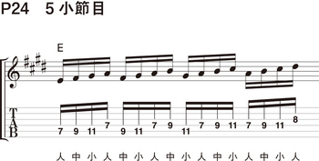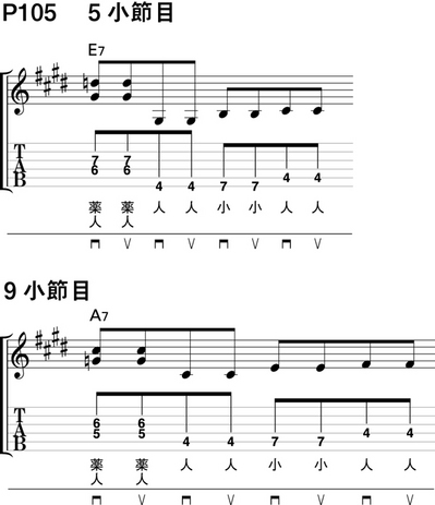 9小節目1拍目の3弦5フレットは、正しくは3弦6フレットです。