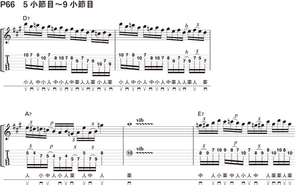 3弦7フレットのD音として表記されている音は、正しくは3弦9フレットのE音になります。正しくは、以下の譜面の通りです。