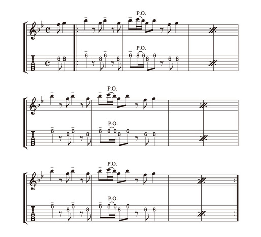 譜例内、3/7/11小節のタブ譜に誤りがありました。正しくは下記の通りです。