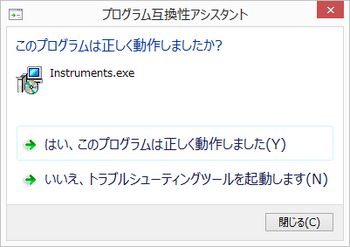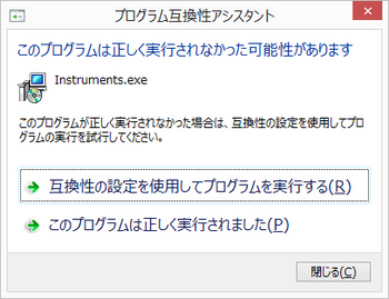 「OK」をクリックすると、以下の「プログラム互換性アシスタント」画面が表示されます。ここで「互換性の設定を使用してプログラムを実行する」をクリックしてください。インストーラーの画面が表示され、インストールを続行できます。![]()