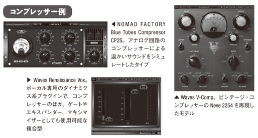 「コンプレッサー例」の画像においてキャプション文に誤りがありました。「Waves V-Comp」以下のキャプション文は、正しくは現状の「Waves Renaissance Vox」に付けるものでした。同様に「Waves Renaissance Vox」以下のキャプション文は、現状の「Waves V-Comp」に付けるべきものでした。正しくは以下の画像のようになります。