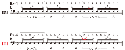 Ex-4bの譜面におきまして、アクセントが誤った位置で掲載されておりました。該当部分は譜面上段【誤】の赤枠で囲まれた箇所で、譜面下段【正】の赤丸が正しい位置となります。