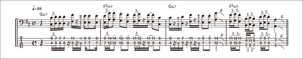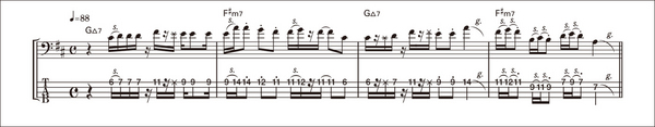 5弦アコベによるプレイ。旋律を際立たせるため、オクターヴ奏法によってフレーズを展開させている。その結果、スライドを多用することで、メロウなラインを、よりなめらかにするという相乗効果を生んでいる。スライドは16分音符を曖昧にさせがちだが、ここではカッチリと16分を意識している。