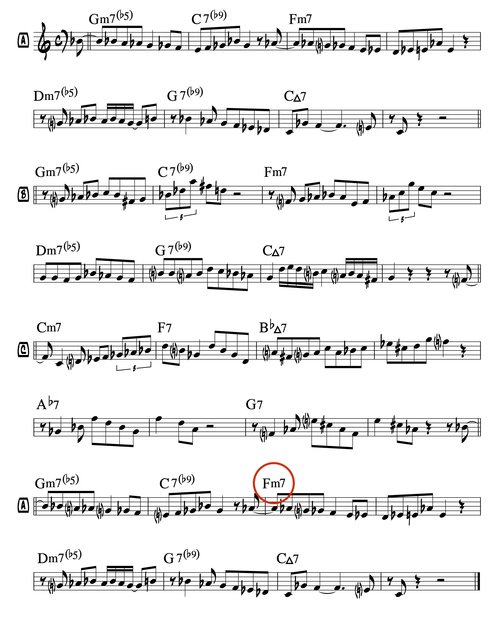 8小節目にフラット記号が抜けていました。以下が正しい譜面です。