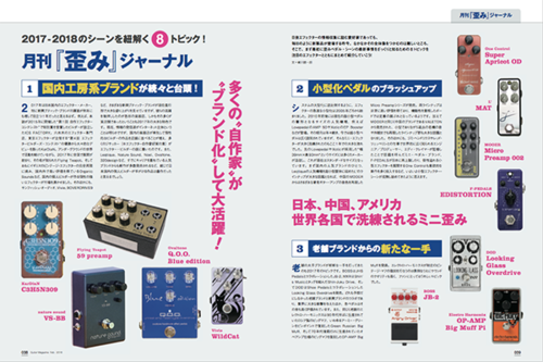 時は平成三十年(2018年)─今、日本の"歪みエフェクター・シーン"が熱い。絶大な支持を集める大手メーカーから新興ブティック・ブランドまでがひしめき合い、プレイヤーの感性を刺激する魅力的な製品を日々世に送り出し続けているのだ。特に2017年は、王道モデルと人気エフェクターのコラボレーションやこだわりを持った個人ビルダーたちの躍進、老舗がピンポイントで自社のビンテージ・ペダルを復刻するなど、さまざまなトピックが市場を湧かせた。しかし、これらはあくまで"予兆"に過ぎず、今年はさらなる盛り上がりが予想される。さながら"歪みペダル戦国時代"へと突入していくことだろう。