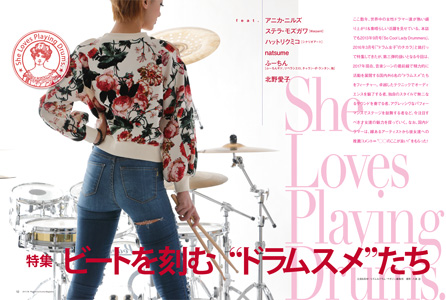 巻頭特集は、女性ドラマー企画@2017! 今回もシーンの最前線で活躍する国内外6名の"ドラムスメ"をインタビューしてきました。ワールドワイドに活動を展開するもの、バンドで、サポート/セッションで存在感を放つものなど、今注目の才女たちにスポットを当てていきます。国内ドラマー4名は、縁のドラマーからの推薦コメントつき!