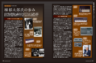 2017年4月に、惜しまれながらもこの世を去った梯郁太郎氏。日本が世界に誇る電子楽器の技術者である。梯氏はエース電子工業の設立/経営をへて、1972年にROLANDを創業。約40年に渡り同社に在籍し、数々の電子楽器/音響機器を開発してきた。1982年には、メーカーを問わずさまざまな電子楽器を接続して使うための国際標準規格=MIDIの開発/制定を主導。2013年にはその功績が評価され、"テクニカル・グラミー・アワード"を受賞した。そして近年は、83歳にして新メーカーATVを設立し、人生の集大成とも言える電子楽器を開発。この特集では、音楽制作に従事する世界中の人々に、優れた楽器や機材を提供し続けた梯氏の偉業を振り返る。氏をリスペクトしている人はもちろん、これから音楽の世界を担っていく世代にもご一読いただきたい。