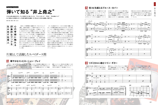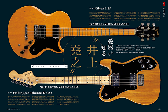 横山健(Ken Yokoyama/Hi-STANDARD)と生形真一(Nothing's Carved In Stone/ELLEGARDEN)。世界的ギター・ブランドであるギブソンとグレッチで、それぞれ自身の名を冠したギターが製作されるなど、日本を代表するロック・ギタリストである。近年、横山は生形のシグネチャー・モデルであるギブソン製SHINICHI UBUKATA ES-355を購入し、Hi-STANDARDやKen Bandのライブで愛用。それを知った生形もまたグレッチ製Kenny Falconを手に入れ、ステージで使用するなど、互いへのリスペクトがファンの間で話題を呼んでいた。そんな両者の特別対談が誌上で実現! しかもお互いの愛用機材を持ち込んでもらい、それぞれがライブで実際に使用している"相手の"セッティングで試奏をしてもらった。ギターを大型スタック・アンプに直接プラグインし、質実剛健なスタイルでギターをかき鳴らす横山健。片や、巨大なエフェクト・ボードにセットされたさまざまなペダルを駆使して音楽に多彩な彩りを加える生形真一。両者のプレイ・スタイルを浮き彫りにする貴重な検証企画も見逃せない。音楽シーンに刺激を与え、牽引し続けている両者が心の内に秘める流儀とは?