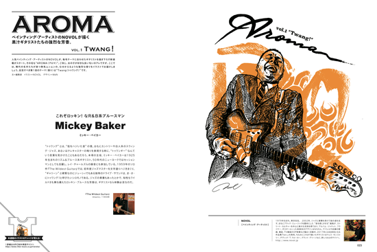 人気ペインティング・アーティストのNOVOLが、毎号テーマに合わせたギタリストを描き下ろす新連載がスタート。その名も"AROMA(アロマ)"。ご存じ、女の子が好きな良い匂いのアレですが、ここでは、稀代の名手たちが放つ熱気ムンムンの、むせかえるような強烈な香りをイラストでお届けしましょう。記念すべき第1回のテーマ(香り)は"Twang(トゥワング)"です。