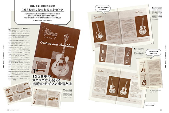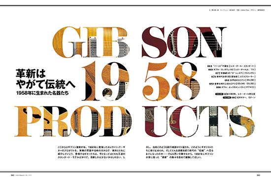 ここからはギブソン激動の年、1958年に登場したエレクトリック・ギターのプロダクトを、実機の写真や当時のカタログ/資料とともに紹介していこう。登場するギターたちは、今となってはどれも王道のスタンダード・モデルばかりで、目新しさは少ないかもしれない。しかし、当時どのような試行錯誤がくり返され、どのようにギタリストたちに受け止められ、そしてどんな過程を経て現代の"伝統"へ至るまでになったのか......そんな思いを馳せながら、1958年にギブソンが世に放った"革新"の数々を改めて俯瞰してほしい。