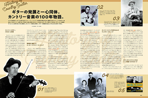 アメリカ音楽の"へそ"とも言えるカントリー・ミュージック。その歴史を探るのはそう簡単ではないが、ここではギター音楽としてのカントリーを見つめ、今日までの長い道のりをたどってみるとしよう。そこで見えてくるのは、ギターという楽器とずっと二人三脚で歩んできた真実だ。カントリーの歴史と同時に、ギターの発展史も楽しんでもらえれば幸いである。