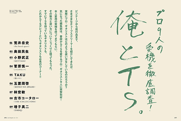 ビンテージから現行品まで、さまざまなチューブスクリーマーを紹介してきたが、実際にプロ・ギタリストはどのような使い方をしているのだろうか? 気になった編集部は、普段からTSを愛するプロ・ギタリスト9人に突撃取材! 本人愛用の実機を持ってきてもらい、その魅力と使い方についてじっくりと語ってもらった。すでにTSを持っているギタリストも、これからTSデビューというギタリストも必見のコーナー!!