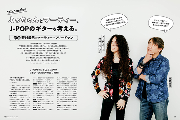 J-POP大特集のラストはこのふたりが登場! 平成屈指の歌姫である浜崎あゆみをデビュー時から支えてきた野村義男と、J-POPに魅せられて活動拠点まで日本に移したマーティー・フリードマンの両名だ。日本独自のポップ・ミュージックとしてJ-POPが開花する中、ギターはどのような形で必要とされ、そのサウンドを響かせてきたのか?そして洋楽と邦楽の大きな違いとは?シーンを熟知したふたりにさまざまな疑問を投げかけ、J-POPでのギターについて大いに語り合ってもらおう!