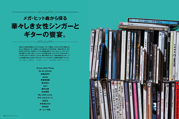 話が前後してしまったが、今月は " CDが最も売れた時代"だったJ-POPの黄金期、およそ90年代中盤から00年初頭までの特集だ。その中でもメガヒットを量産した女性シンガー、つまり、4つ打ちにヘヴィ・ギターをブチ込んだEvery Little Thing、良質なメロディとイナたいロックが最高の相性を見せたaiko、本格R&B+メロウ・ギターという図式でシーンを席巻した宇多田ヒカル、ハードロックを新感覚エンターテインメントに仕立て上げた相川七瀬、ユーロビートにブ厚いギターを組み合わせた時代の寵児=浜崎あゆみ、軽快なディスコ/ファンクでギターが主役となりえたSPEEDなどなど、平成が生んだ奇跡の歌姫たちとギターの関係にフォーカスしている。これに関してできる限り当事者への取材を決行し、それらの証言を元にしたひとつの結論が冒頭の一文なのだ。