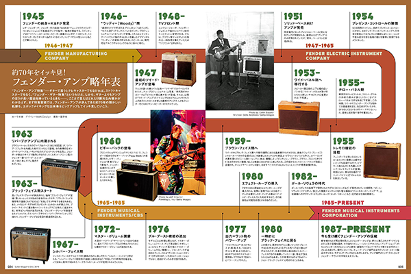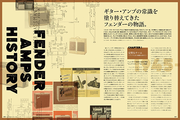 "フェンダー・アンプ特集"ーーギターで言うとテレキャスターでもなければ、ストラトキャスターでもなく、"フェンダー・ギター特集"というわけだ。しかも、ギターよりもアンプのほうが長い歴史を持っているときた......。ここまで言えばどれだけ膨大な内容かがわかるはず。まず特集冒頭では、フェンダー・アンプが歩んできた約70年の輝かしい軌跡を、エポックメイキングな出来事をピックアップしてイッキ見していこう。