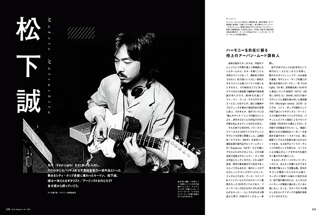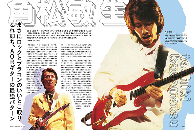 主な登場人物は、土方隆行、松下誠、芳野藤丸、松原正樹など。吉田美奈子、角松敏生、松任谷由実、杏里、AB'Sといった珠玉のシティ・ポップ名盤を根幹から支える、まさに80's Japanese Grooveを体現するギタリストたちだ。当然、特集内には彼らの残した名フレーズを掲載しているが、実際に弾いてみると、各人のスタイルがそれぞれ全然違うことに気がつくはず。ボイシングも、リズム・パターンも、何もかもがだ。まったくもって、カッティングは奥が深い。