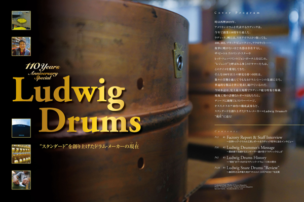 今号の表紙は創業110周年という節目を迎えた、アメリカを代表するドラム・メーカー、ラディックの総力特集。現地工場レポートをはじめ、"現代"のラディックにつながるヒストリー解説、現行スネア・ドラム40台叩き比べ、ラディック・アーティストの愛用機材など、Ludwig Drumsの現在(いま)に迫る!