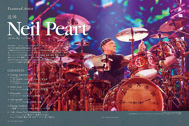 1974年に、カナダ、トロント出身のバンド、RUSH(ラッシュ) への加入から、2015年の結成40周年を記念した"R40ツアー"まで、常にRUSHのドラマーとして世界中の人々(ドラマーのみにあらず!) に多大なる影響を与え続けてきた音楽家、ニール・パート。プログレッシヴ・ハード・ロック・バンドとしてのRUSHから、世界のロック・バンドとしてのRUSHまで、バンドの成長・成熟・進化・深化と共にあった彼のドラミングの"個性" は、まさに"唯一無二" という言葉が最もふさわしい。2018年12月の完全引退を経て、2020年1月7日に天国へと旅立った偉大なるレジェンドへの哀悼の意を込めて、ドラマー、ニール・パートの魅力に迫ってみたい。