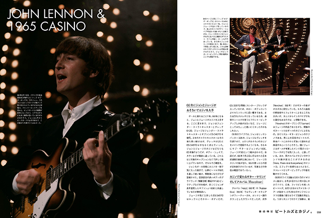 エピフォン・カジノを語るうえで、ビートルズの存在ははずせない。そしてビートルズにとっても、カジノは音楽性と想像力を拡げる重要なアイテムであった。ジョン、ポール、ジョージの3人は一体どんな個性を用い、どんな楽曲やライブを彩ったのか? わかる範囲で徹底的に検証してみよう。