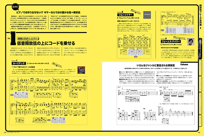 今月は久しぶりに奏法特集をお届け! テーマは"開放弦"です。ギターが持つさまざまな魅力の中でも、開放弦を組み込んだコードの豊かな響きと広がり感は、ギターならではのキャラクターが鮮やかに浮き出るツボのひとつです。そこで今回は、これからやってくる夏本番をクールに過ごすギター・ライフをイメージして、アコースティック・ギターで開放弦を爽やかに鳴らす古今東西の名演をドカ~ンと集めてみました。どのサンプルも"弾けば納得!"のナイスなアイディアが盛り込まれていますので、ぜひトライしてみて下さい(各譜例はいちおうアコギの演奏サンプルですが、もちろんエレキで弾いてもOKですよ~)。さぁ、"新しい生活スタイル"でのサマー・シーズンに向けて、開放弦を爽快に響かせましょう!