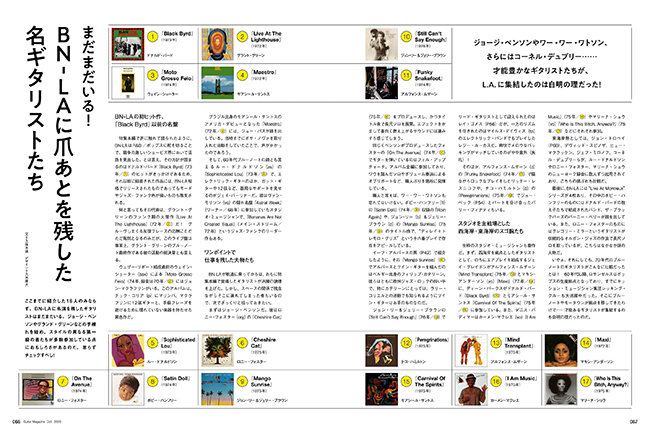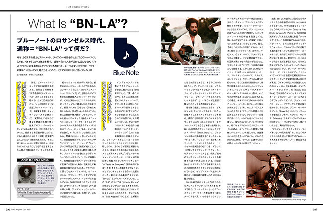 昨年、ブルーノートは創立80周年を迎えた。遅ればせながらそれを祝うべく、今回我々が注目したのは70年代。正確に言うと、NYからLA移転したあとの、 通称"BN-LA"と呼ばれる時代だ。当時はロックの台頭やソウルの流行、さらにはマイルスの電化も相まって、ジャズ・ギタリストたちは急速なエレクトリック化を余儀なくされていた。彼らの試行錯誤が、のちの"クロスオーバー/フュージョン"に結実......するのだが、その前夜とも言えるBN-LAの諸作には、超メロウでファンキーなギター・プレイがくり広げられているのだ。参加したのは、デヴィッド・T.ウォーカー、リー・リトナー、ラリー・カールトンを始めとする、一流ギタリストたちの面々。本特集では、彼らの"新時代の音を作ってやる"という気概のこもったプレイの数々を通じ、そのドラマと偉業に迫っていく。