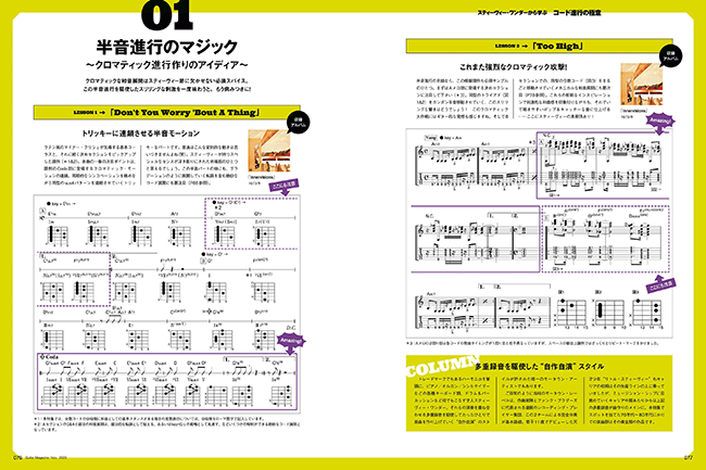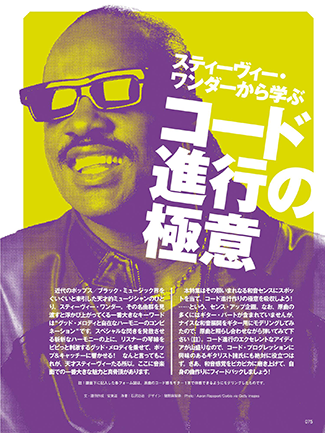 近代のポップス/ブラック・ミュージック界をぐいぐいと牽引した天才的ミュージシャンのひとり、スティーヴィー・ワンダー。その名曲群を見渡すと浮かび上がってくる一番大きなキーワードは"グッド・メロディと自在なハーモニーのコンビネーション"です。スペシャルな閃きを発散させる斬新なハーモニーの上に、リスナーの琴線をビビっと刺激するグッド・メロディを乗せて、ポップ&キャッチーに響かせる! なんと言ってもこれが、天才スティーヴィーたる所以。ここに音楽面での一番大きな魅力と真骨頂があります。本特集はその類いまれなる和音センスにスポッ トを当て、コード進行作りの極意を吸収しよう! ......という、センス・アップ企画。なお、原曲の多くにはギター・パートが含まれていませんが、ナイスな和音展開をギター用にモデリングしてみたので、原曲と照らし合わせながら弾いてみて下さい。コード進行のエクセレントなアイディアが山盛りなので、コード・プログレッションに興味のあるギタリスト諸氏にも絶対に役立つはず。さあ、和音感覚をピカピカに磨き上げて、自身の曲作りにフィードバックしましょう!