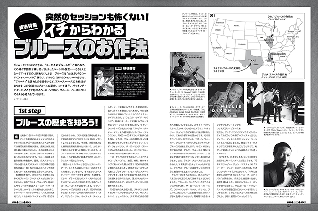 セッションの基本ともいえるブルース。しかし、なんとなく"ブルースっぽく"弾くだけでごまかしていないだろうか? ブルース・セッションの常套句を始め、独特のシャッフル感やウォーキング・ベースのノリをしっかりとつかんで弾くための方法論を解説する。