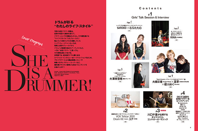 今回の女性ドラマー特集は、従来の内容から趣向を変えて、ドラマーとしての活動はもちろん、その個性豊かな"ライフ・スタイル"にもフォーカス! 物心ついた頃からプロを意識していたトップ・ミュージシャンもいれば、音楽とは別のフィールドからドラムへの挑戦を始めたアーティストなど、一口に"女性ドラマー"と言っても、その事情は実にさまざま。本特集では、彼女達のドラム観に迫るスペシャル・インタビュー&トーク・セッションをはじめ、プロ・ドラマーによる製品試奏レビューや映像つきのレクチャー・コーナーなど、機材選びやスキル習得にも役立つコンテンツをお届けします!