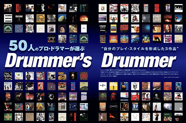 リニューアル第一弾のドラマガで大好評だった特集企画="Drummer's Drummer"。今回はベテランから若手まで総勢50名のプロ・ドラマーに、自身のドラミング・スタイルを語る上で欠かすことのできない3作品についてアンケートを行った! アルバム/シングル/ライヴ映像をはじめ、映画や漫画など、現在のスタイルを形成する上で大きく影響を受けた"作品"をセレクトしてもらった。